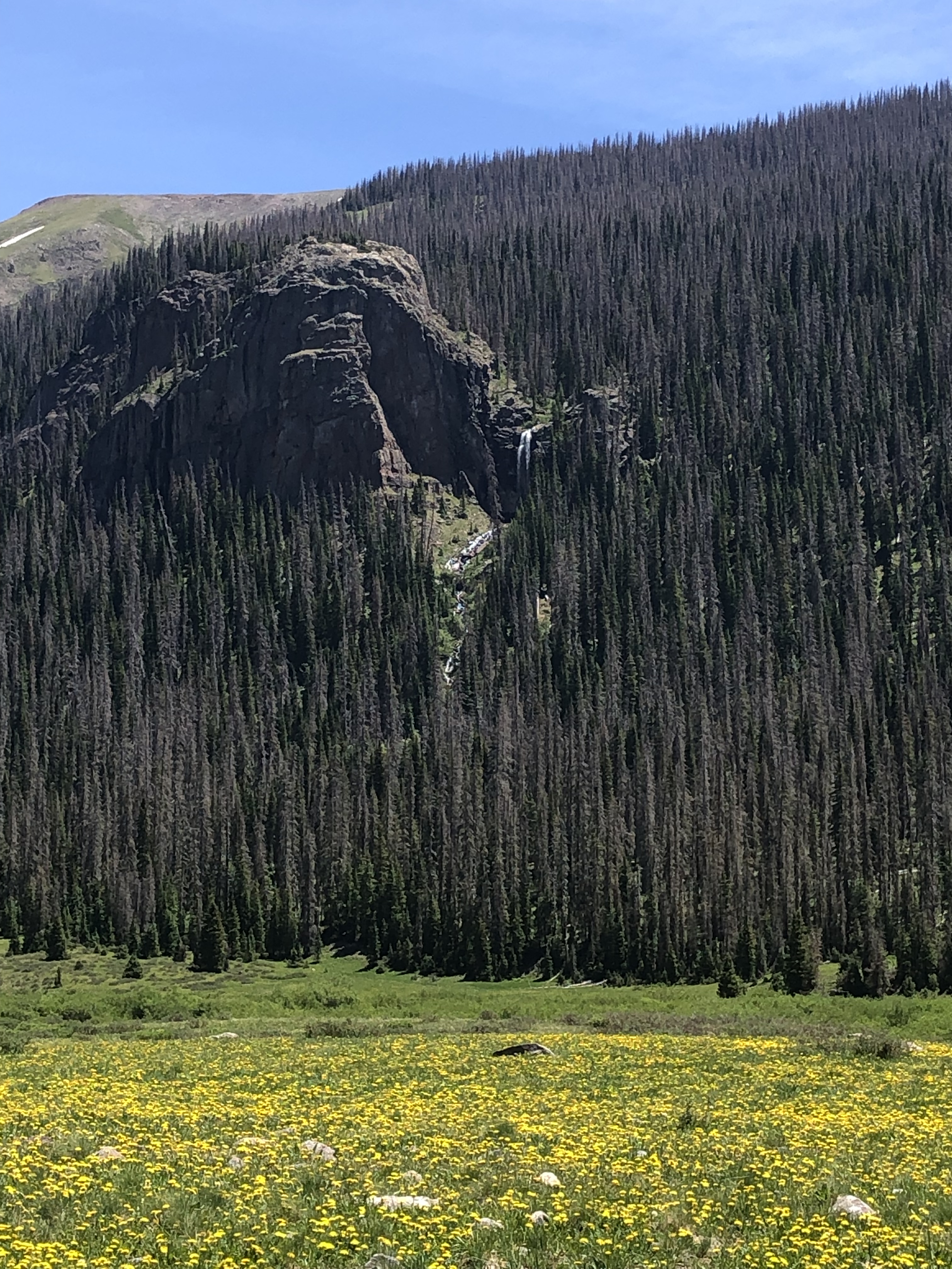 After we parked and loaded up, off we went on the trail, passing through fields of wild flowers and sub-alpine meadows, and into the forest. After the second steam crossing, that was thigh deep and cold, we started running into snow drifts that blocked the trail. The last third of the hike entailed navigating around these, trying to keep the boots dry.