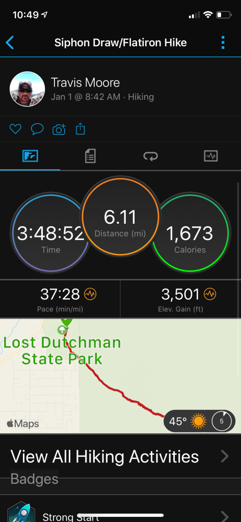 I wanted to start 2020 out with an adventure. I was kicking around a number of things, but I also wanted to be able to spend a good part of the day hanging out with my wife, Staying around Phoenix was obviously the way to go. I had tried to hike Siphon Draw-Flatiron a few years ago, I got off trail above the draw and ended up on the ridge below the Flatiron, saw a snake 3 feet away and called it a day. New Year’s Day seemed like a great day to tick this one off the list!